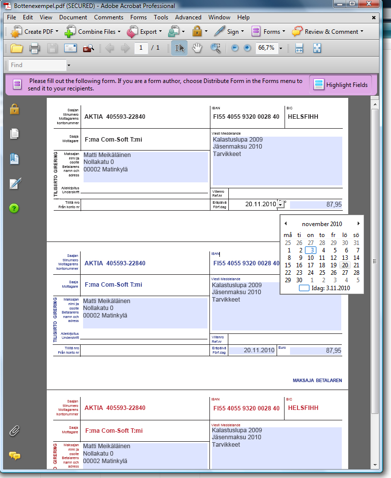 Kätevä tilisiirtolomake esimerkiksi yhdistyksille tai yrittäjille. Jos haluat nopeasti ja helposti tehdä tilisiirto-lomakkeen niin tässä on ehkä helpoin tapa. Et tarvitse muuta ohjelmaa kuin Adobe Acrobat Reader jonka voit ladata ilmaiseksi netistä. Lomakkeen täytät suoraan valmiisiin kenttiin ja tulostat. Paperiin tulostuu kolme tilisiirto-osaa, maksajalle, pankille sekä yksi maksunsaajalle. Rajaton käyttö yhdelle maksunsaajalle, ei vuosimaksua eikä aikarajaa.